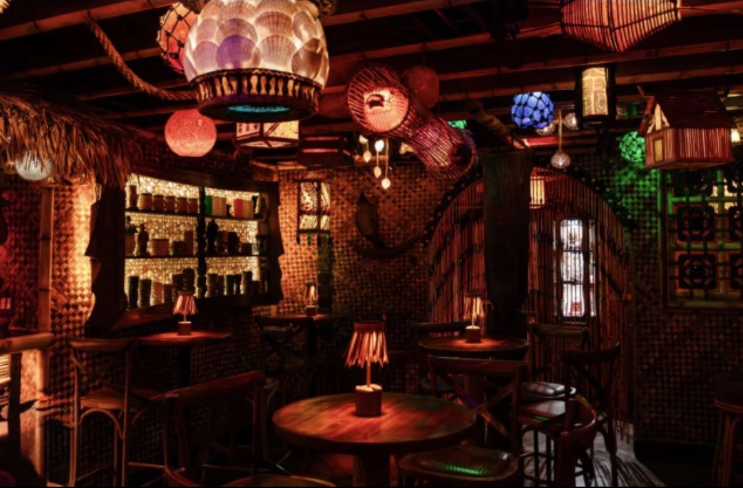 Think basalt and bamboo, torches and tropicals. A cavernous lounge where heat and haze meet bright citrus and island spice. Settle into the warmth; the night slows down here.